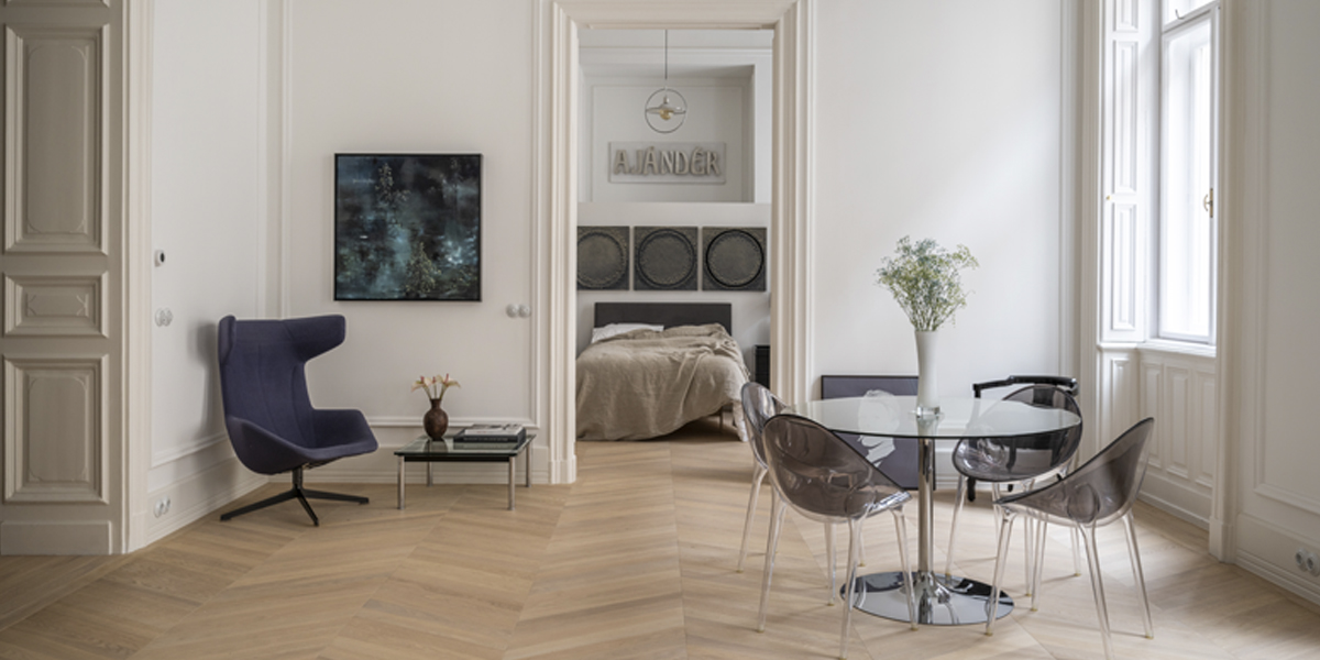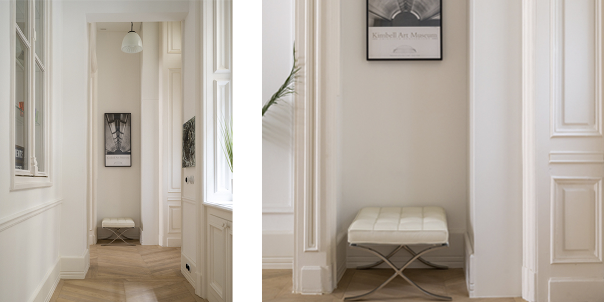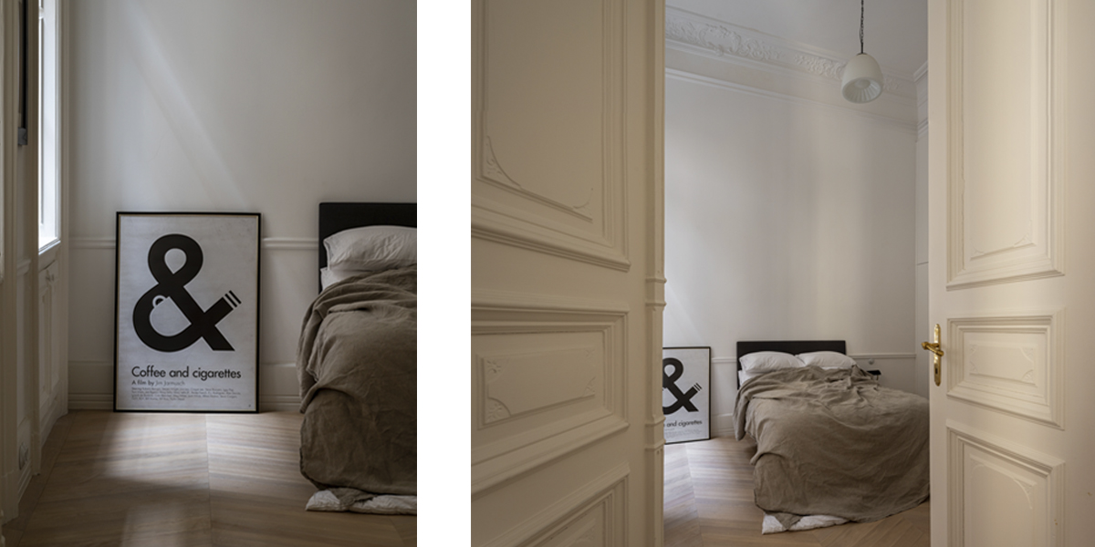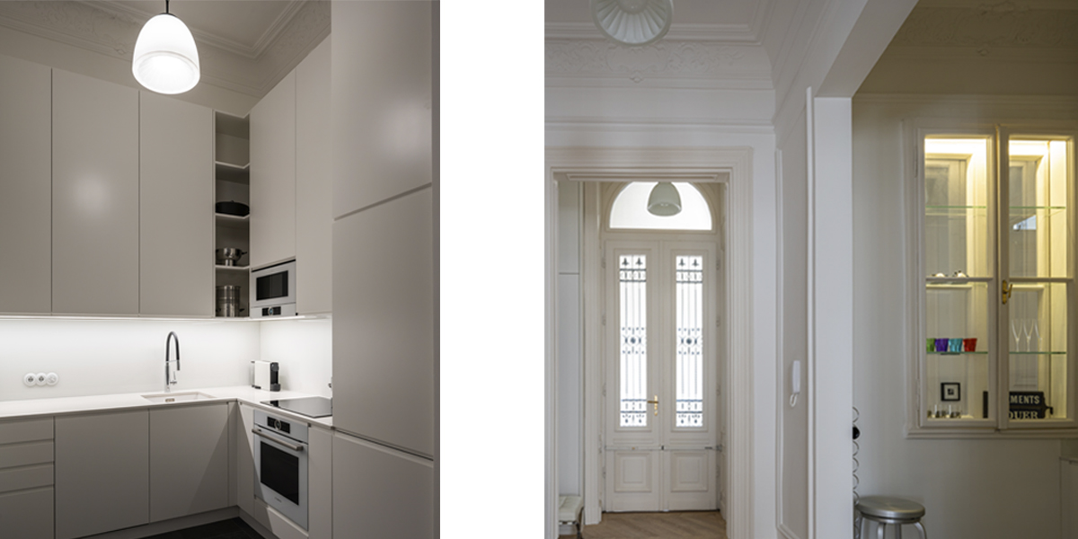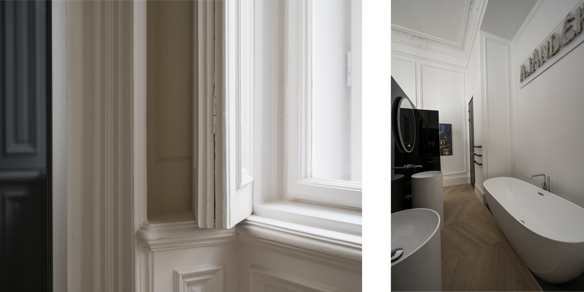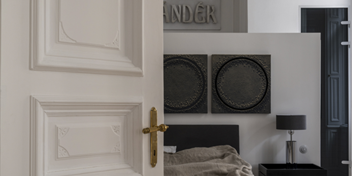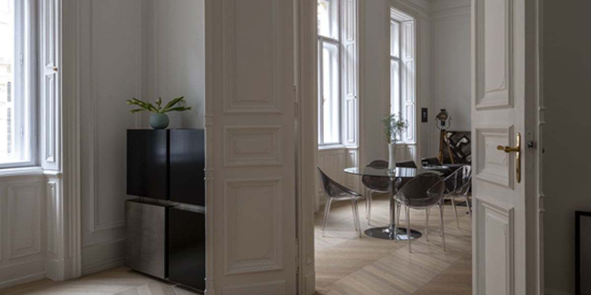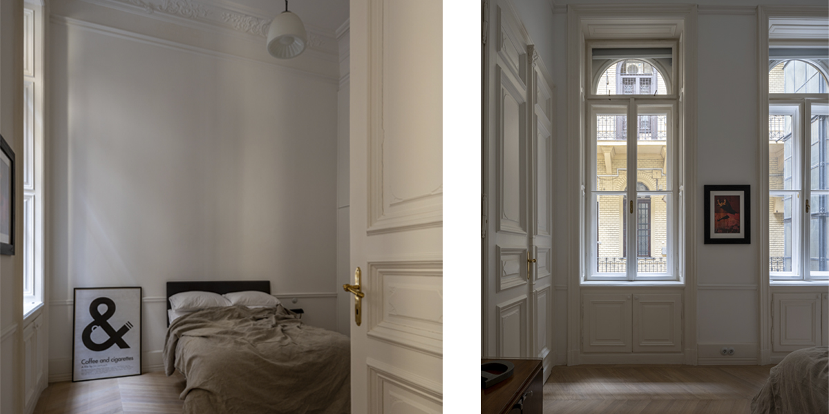 Originate reimagined an historic Budapest apartment on the Nagykörút or ‘Grand Boulevard’. Gustav Lederer designed the apartment building in 1888 and a few original details remained, although in poor shape. The first step was to repair the beautiful windows and shutters. We reinstated cornices, mouldings and skirtings to correct the room proportions as the ceilings are 4.5 metres high. There is a large open courtyard in the centre of the apartment building. This gives access to all the units, and provides natural light to the back rooms. There are also light shafts for added ventilation that proved useful when locating the new air-conditioning system.