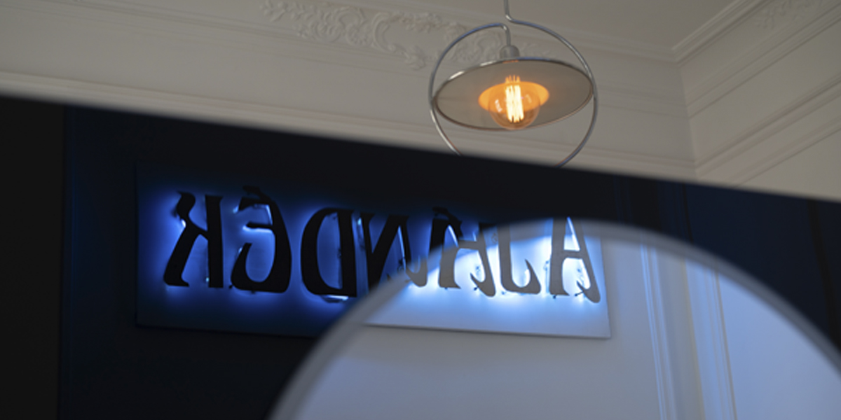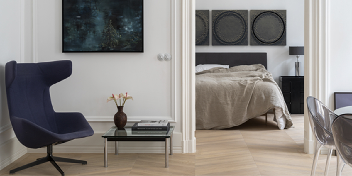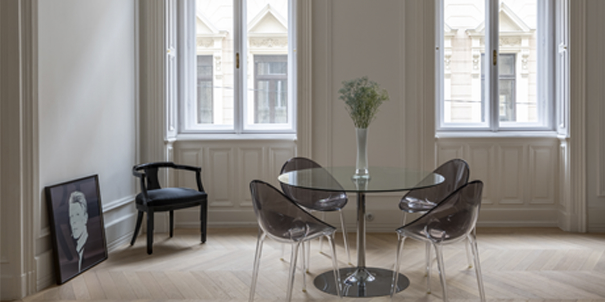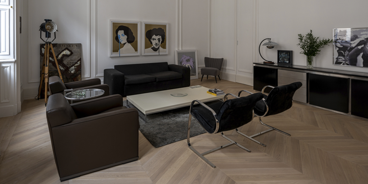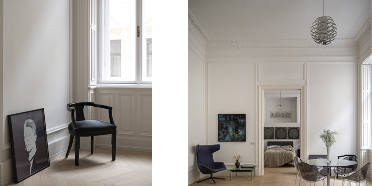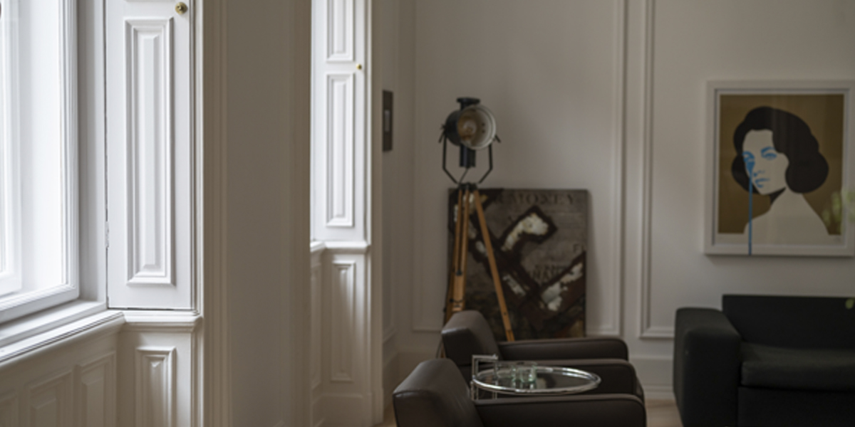In reimagining this historic Budapest apartment, Originate collaborated with the client to choose the furniture and art. Acerbis furniture from the 1970s, such as the ‘Cyclone’ chandelier, was included as a counterpoint to the traditional elements of the refurbishment. We sourced chairs from Paris flea markets, staining them ‘teint noir Napoleon III’ in addition to new horsehair cushions. The Eileen Grey side tables came from the Estate of the singer Dean Martin. For the master ensuite, we found a vintage neon sign that translates as GIFT. The project has been published in a high-quality coffee table book, Understated Elegance.