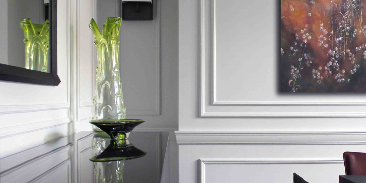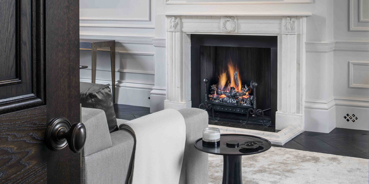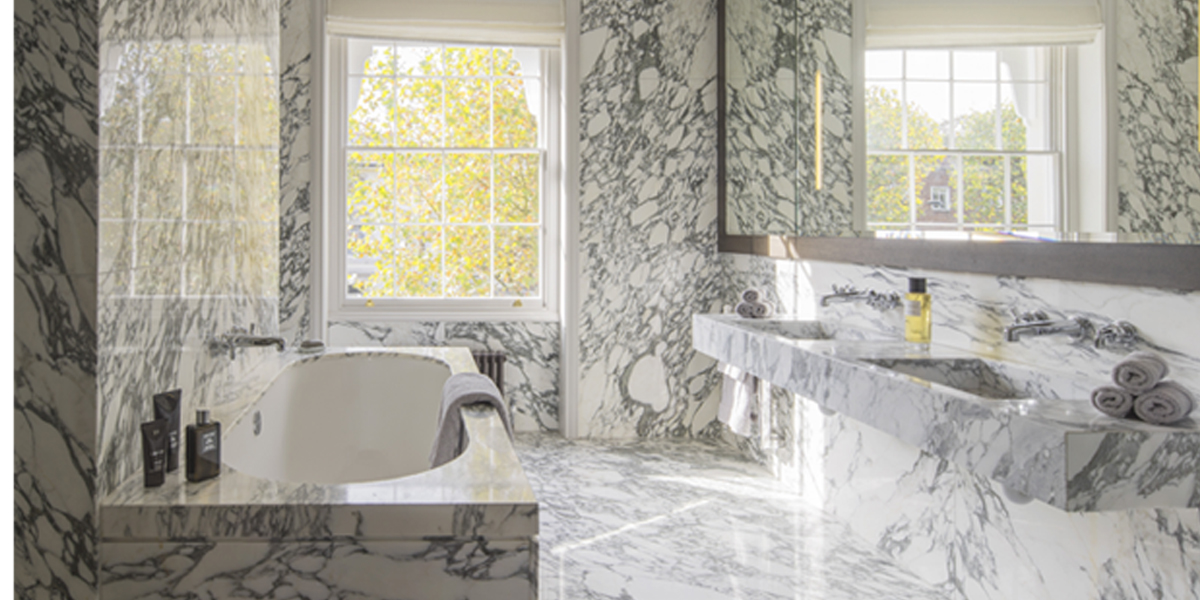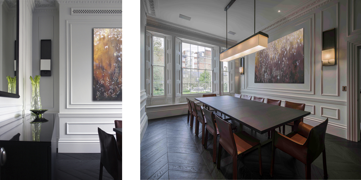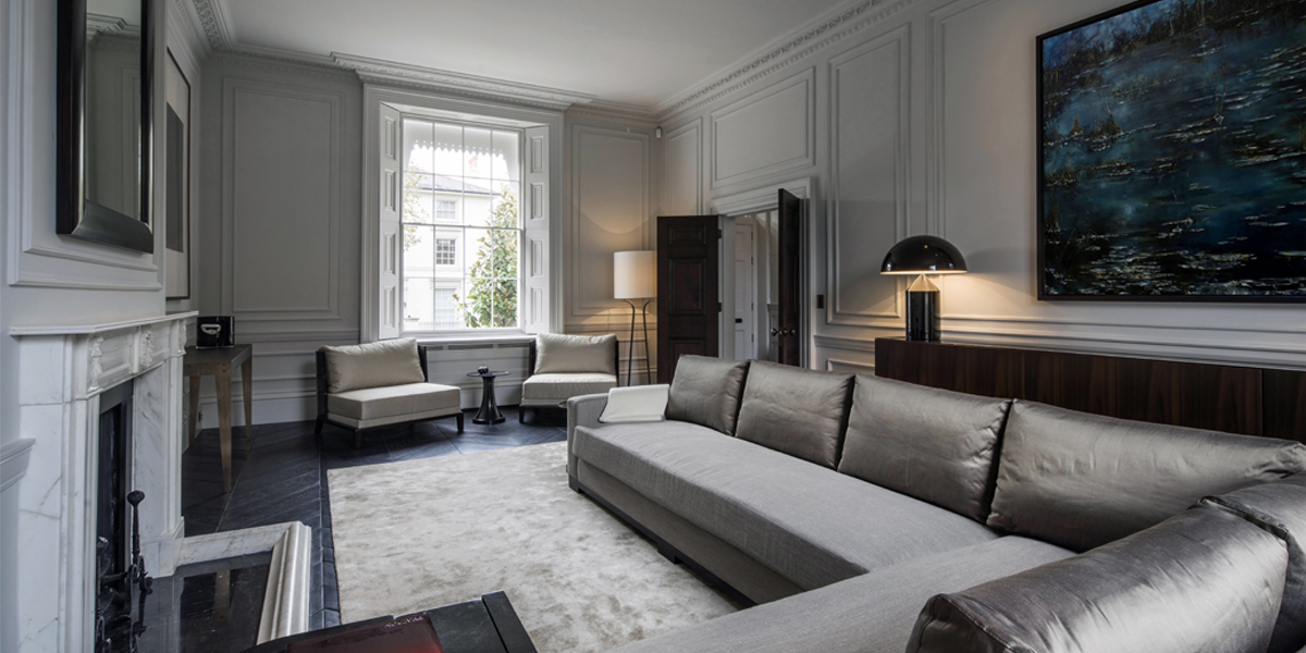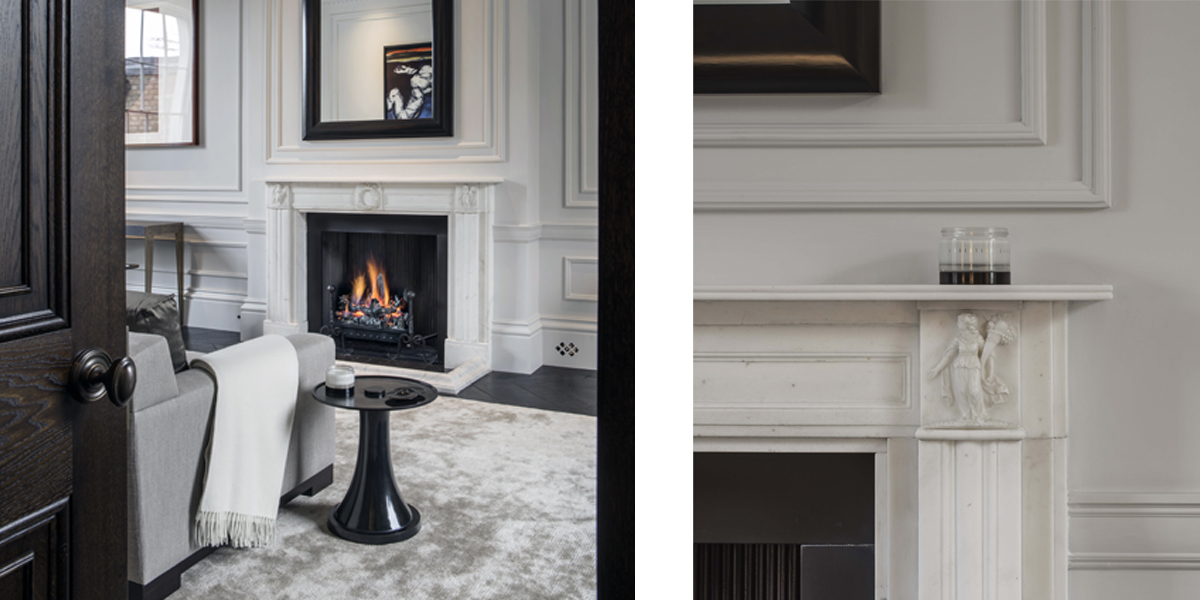 Originate restored the cornices, mouldings and fibrous plasterwork. We added new bronze door hardware, in addition to black-stained Italian oak doors and floors. In the Dining Room, Originate designed the credenza and table, adding Christian Liaigre lighting and Mario Bellini Cab chairs. We concealed the grilles for the air-conditioning in the plaster mouldings. We also designed a bespoke fireplace surround and shelving for the Study. In the Master Bedroom, we designed the headboard, side tables and dressing room joinery. The bathrooms all featured different specially-selected marbles.