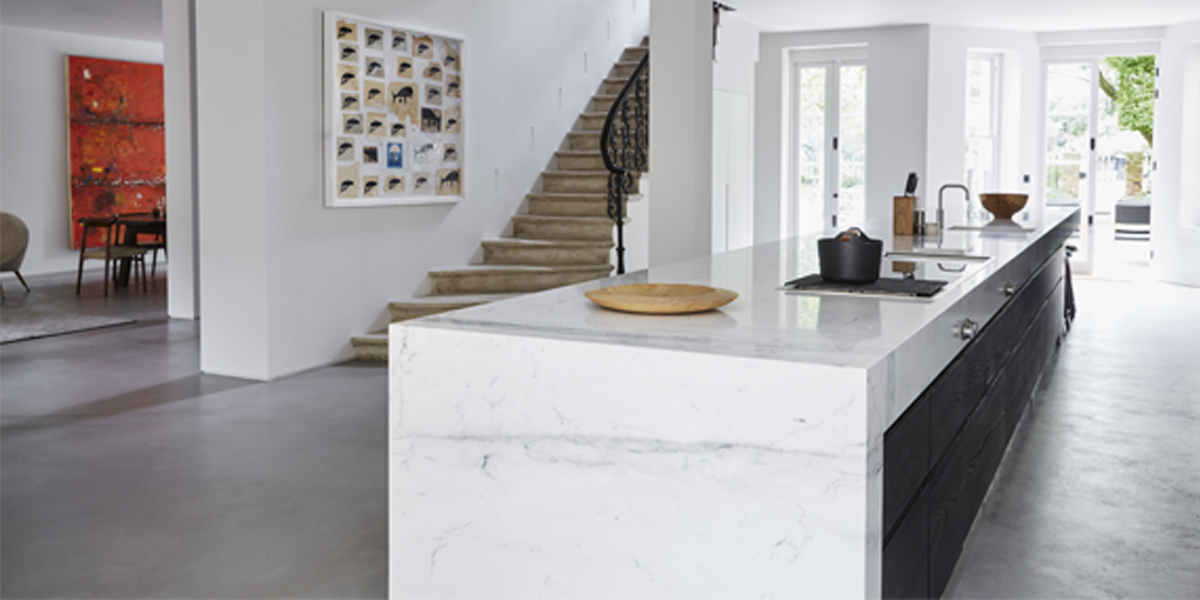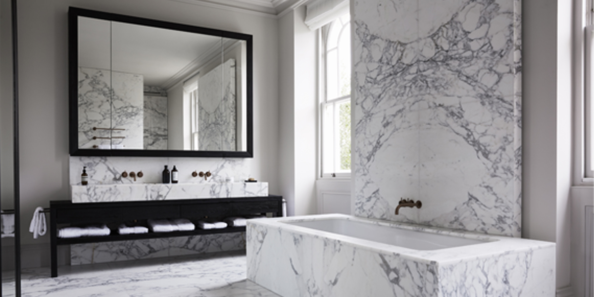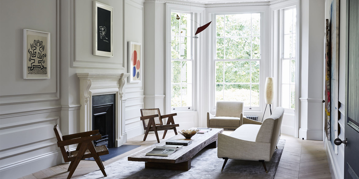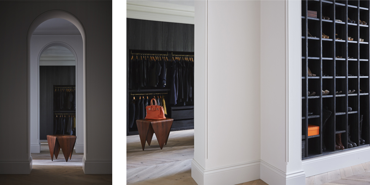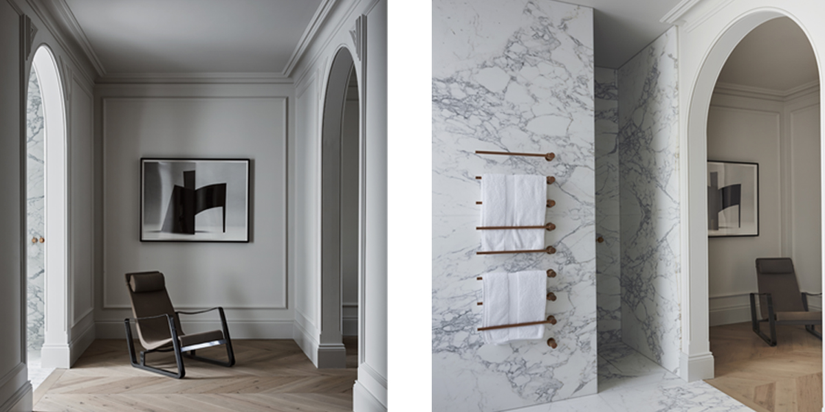 In the main reception rooms, important mid-century furniture pieces by Zalszupin and Jeanneret complement art by Basquiat, Haring and Calder. On the lower ground floor level, the kitchen and dining areas have a minimal, modern look with polished concrete floors and white walls. An eight-metre long marble island forms the centrepiece to the new kitchen. On the first floor, we located the study, master bedroom, master bathroom and dressing rooms. The client wanted as few doors as possible, so that the rooms seemed to ‘flow’ into one another.