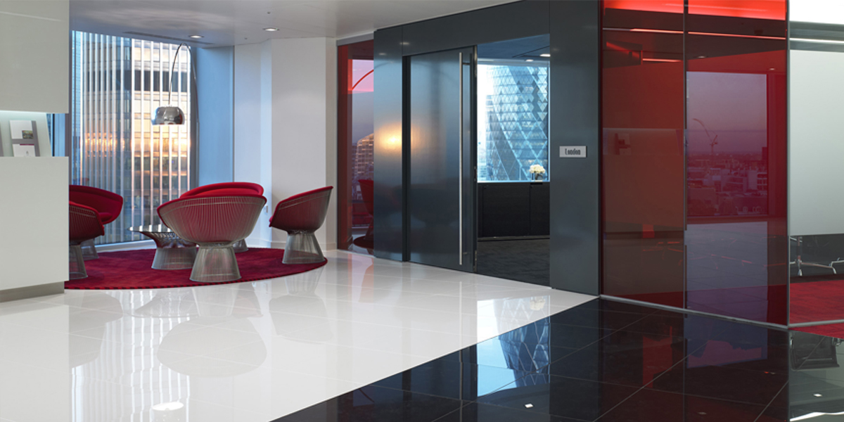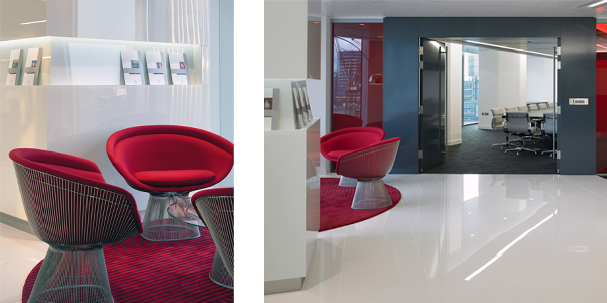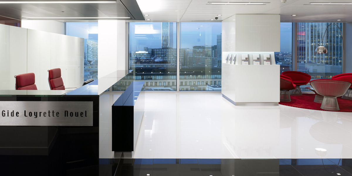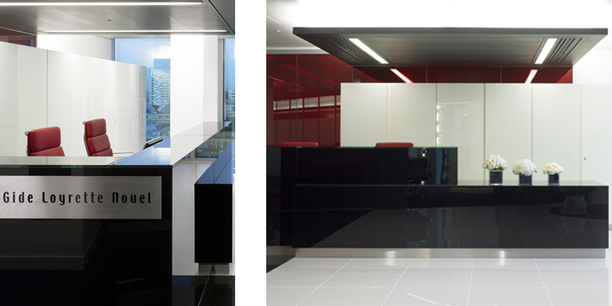 We designed the new London law offices of French-based firm Gide Loyrette Nouel. The main design challenge was to ameliorate the rather low ceiling heights in the refurbished Stock Exchange Building in the City of London. Also, the client was keen to bring ‘drama’ to the space, one that is not normally associated with staid law offices. We chose a stark palette of black, white and red to emphasize the important spaces and to create a ‘two-tier’ ceiling plane to counterbalance the low ceiling height.