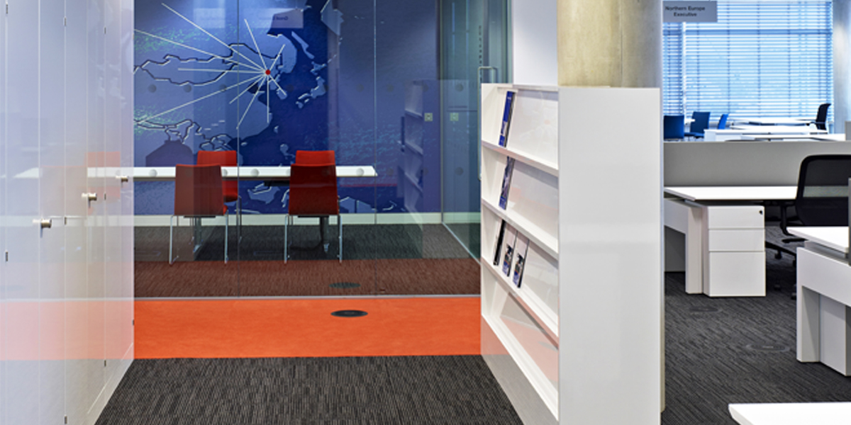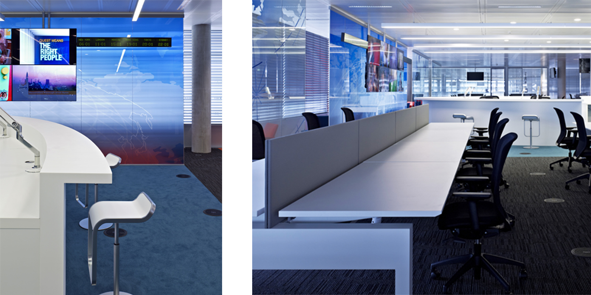 The London office is home to the corporate part of the business that oversees operations worldwide and also includes a Crisis Centre that covers the North European area of operations. Our design concept was to bring the drama of the Operations Hub centre stage so that clients, visitors and staff are instantly aware of the nature of the business. Entering the reception area, a full width glass partition frames the Hub desk where rescue operations are coordinated. We designed a graphic based on the map of the world that affords a degree of privacy to the reception area and reinforces their motto: Worldwide Reach/Human Touch.